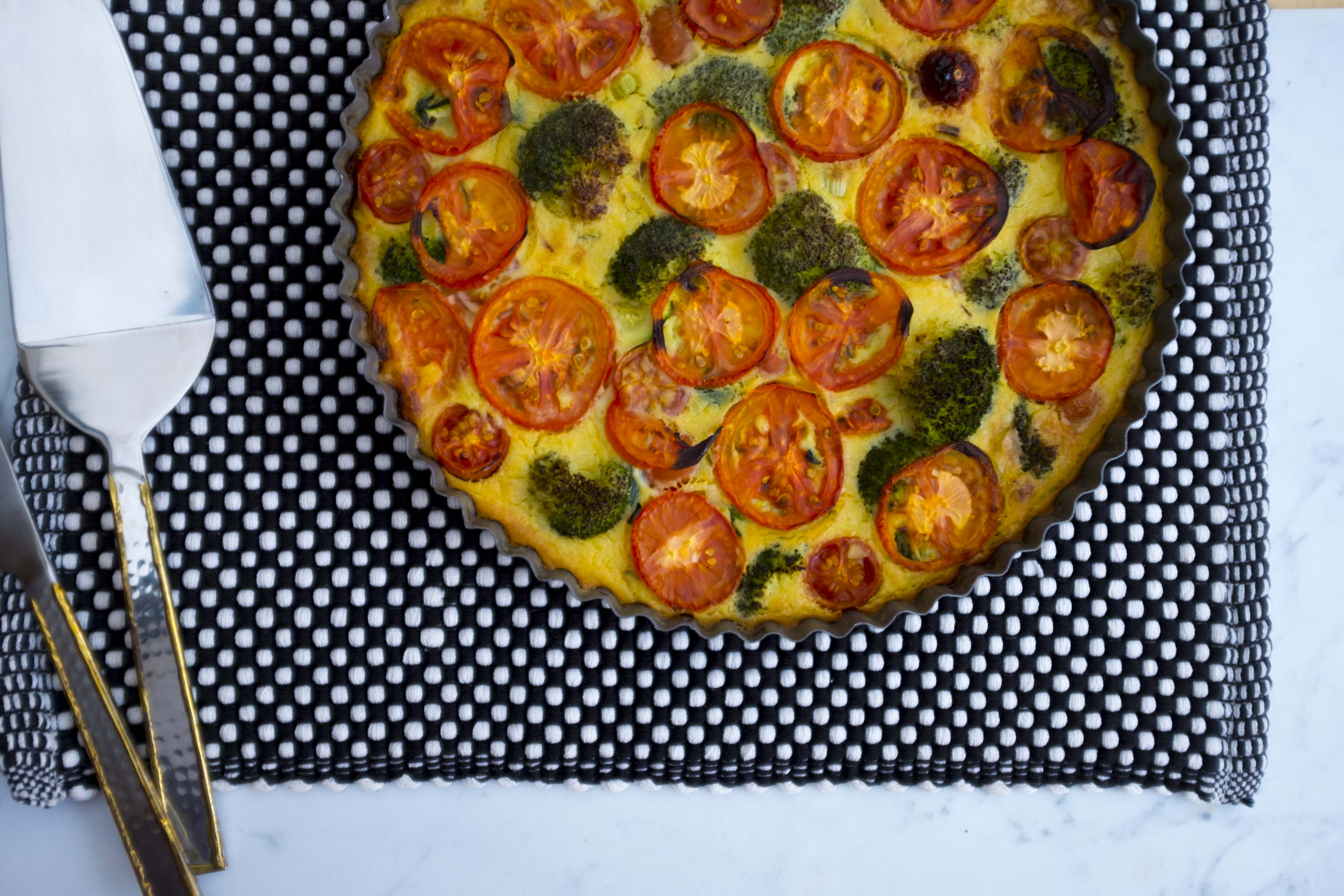 Add the vegetables to the tart dish and add the cherry tomatoes. Evenly pour the chickpea flour mix over the top and then place the sliced roma tomatoes on top.