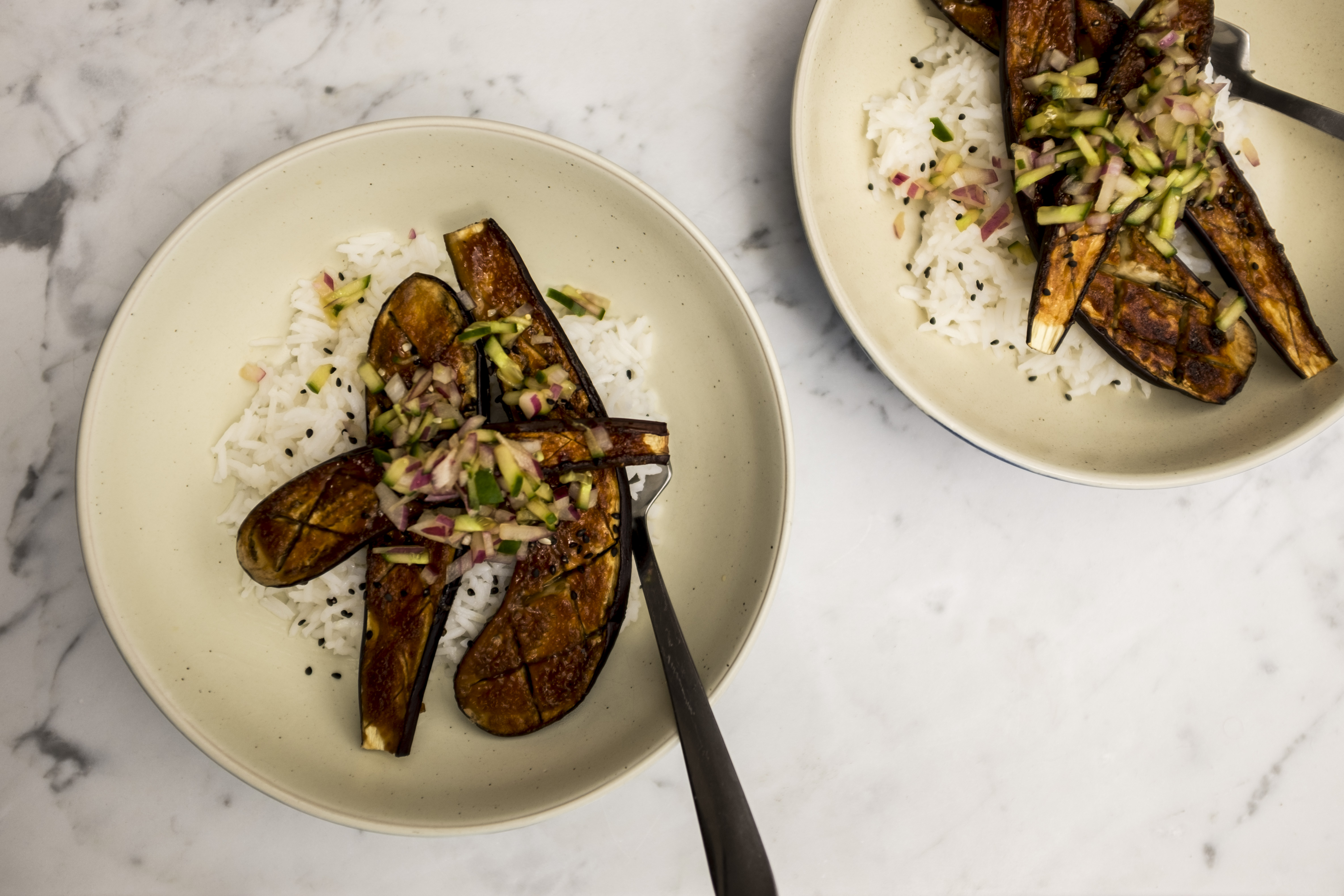 Spoon rice into bowls and lay a couple of eggplant slices flesh side up on top. Then, pour over cucumber and red onion ‘pickle’ and sprinkle with sesame seeds.