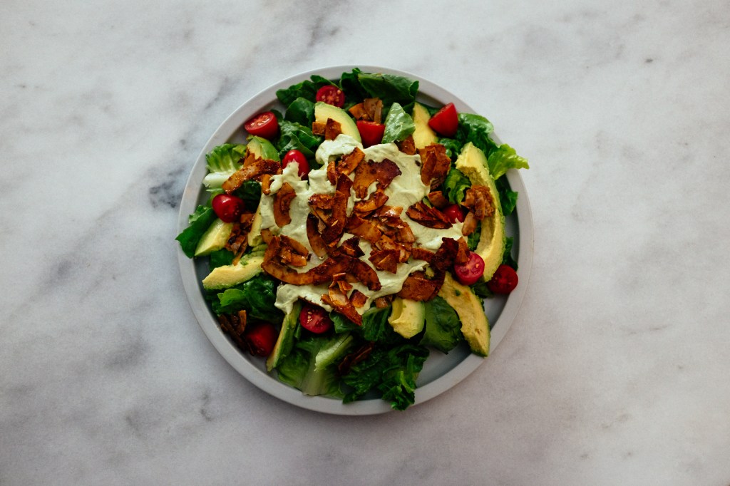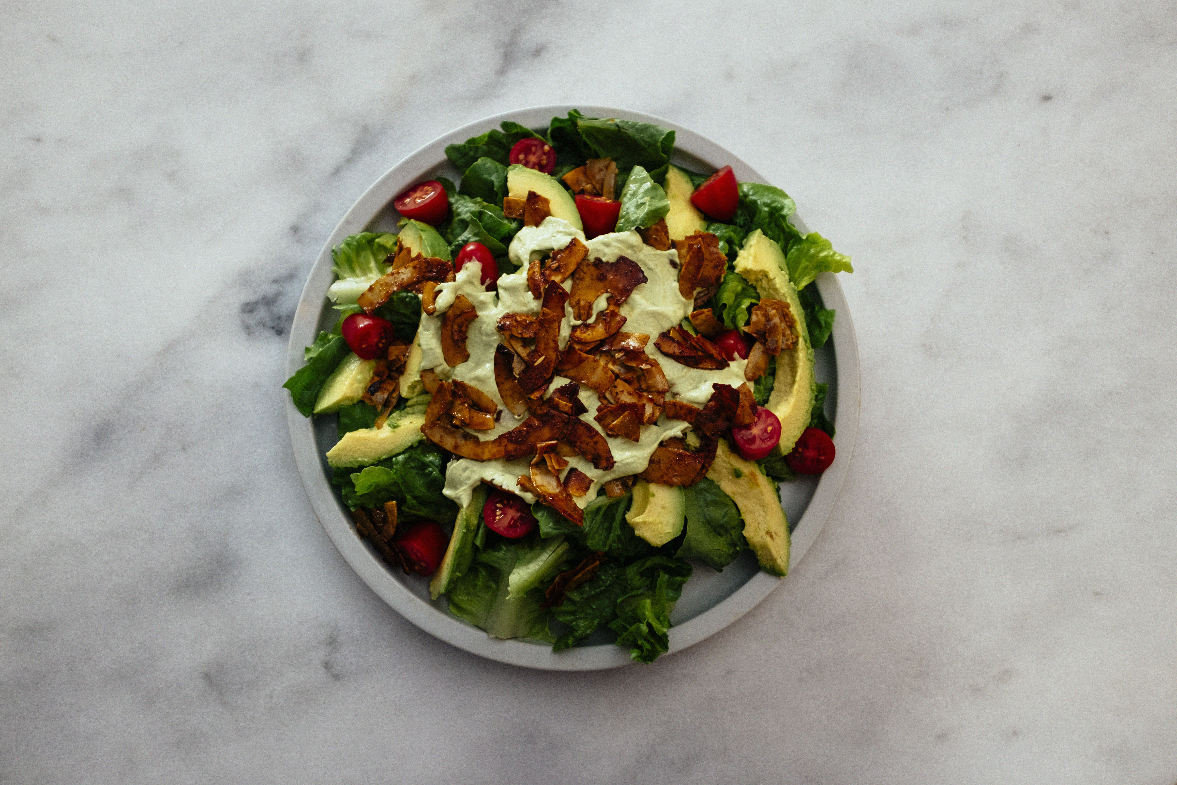 To assemble the salad, place the lettuce leaves in a salad bowl, followed by tomatoes and avocado pieces. Spoon some green goddess ranch dressing in then sprinkle with coconut bacon bits.
