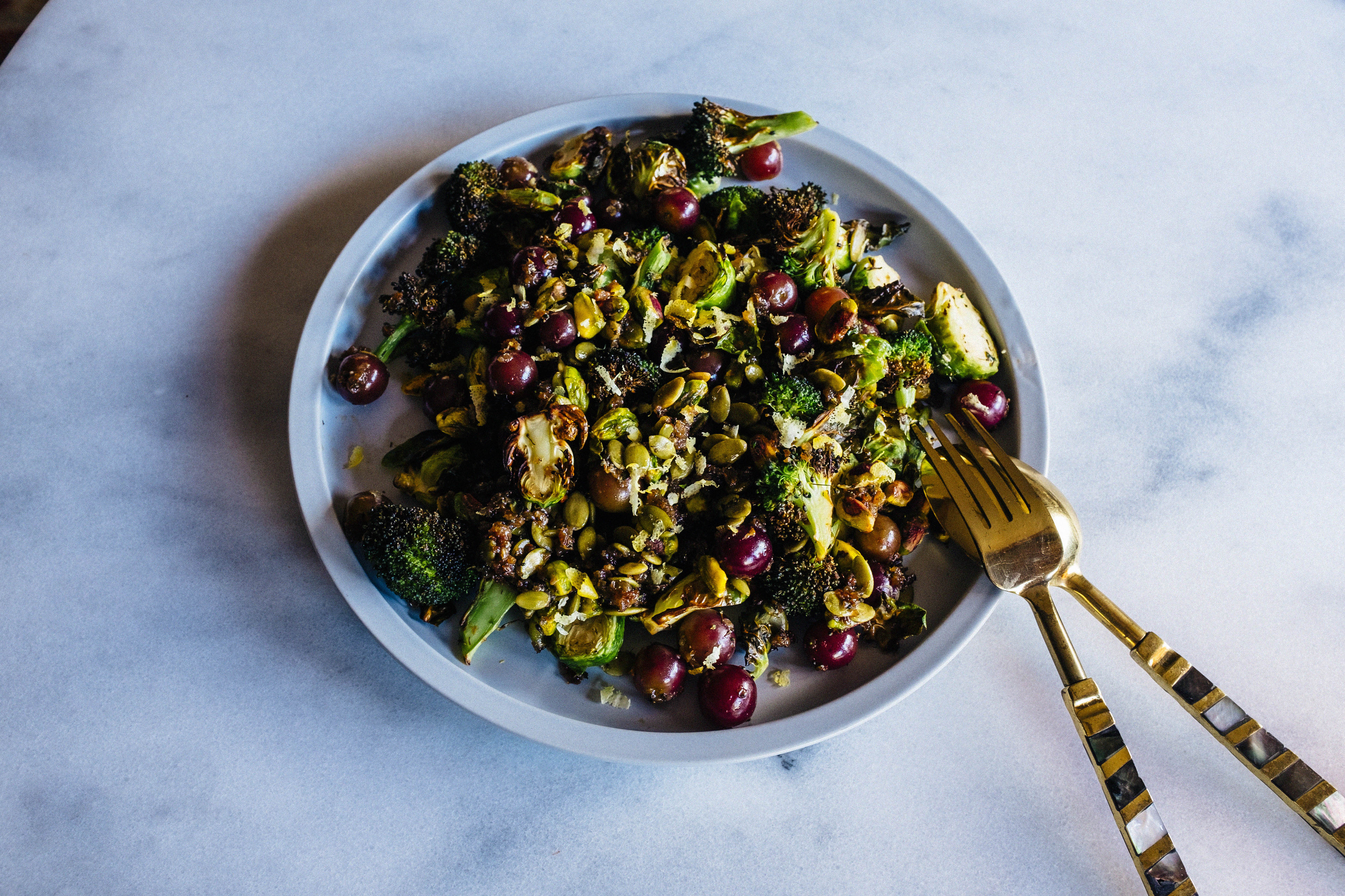 Toss brussels and broccoli with olive oil and salt and pepper.