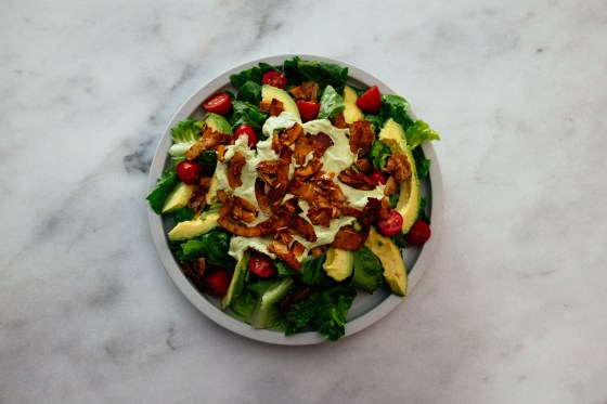 Homemade coconut bacon is my preferred non-meat ‘bacon’. Here, I’ve paired it with a classic BLAT (in salad form) – because a BLT is good, but what is life without avocado?