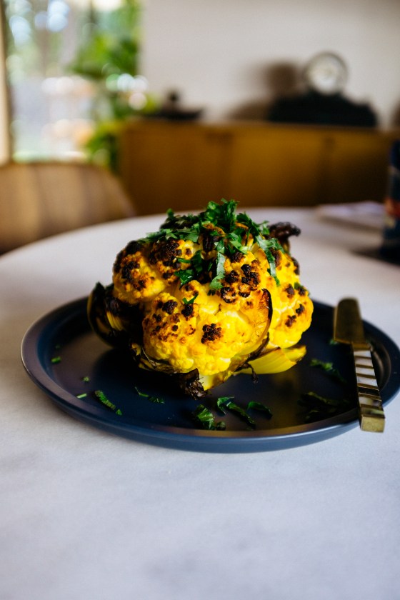 This is the whole roasted cauliflower to end all recipes for roast cauliflower. And the trick is to lightly pre-cook the cauliflower in a magic, white wine-based poaching liquid. Really, there’s not much more to say other than to read on and give it a go.