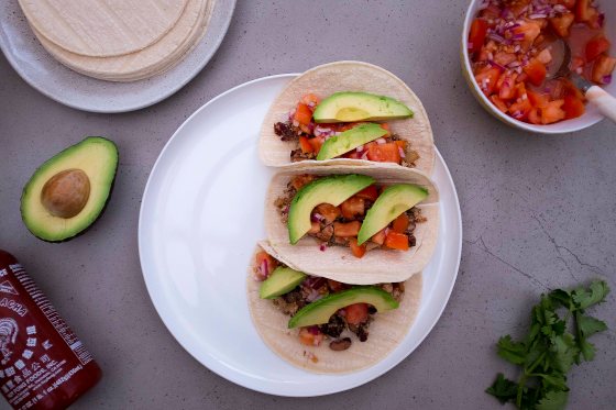 I have been dreaming about getting a good ‘meatiness’ for my tacos before now. Mexican-spiced scrambled tofu wasn’t going to cut it and nor was nut meat, especially after recently discovering I have a mild walnut allergy (just another food allergy/intolerance for the already long list). The secret? A little bit of tofu, a little bit of tempeh, and some baked kidney beans.