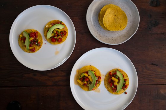 The one thing I like about this time of year? Summer fruit. There are mangoes everywhere, and I’ve been wanting to make these easy tostadas for the longest time. There’s no cooking time involved – only a short amount of prep-time. That’s what you want in summer.